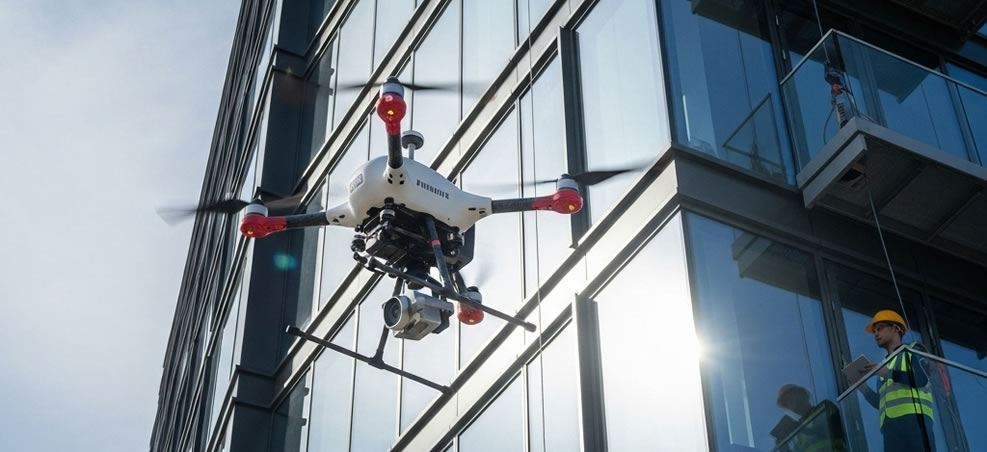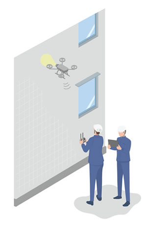国土交通省の許可・承認を取得した上で、ドローンを飛行させて外壁全体を高解像度で撮影します。熟練の操縦士が、安全に配慮しながら作業を行います。