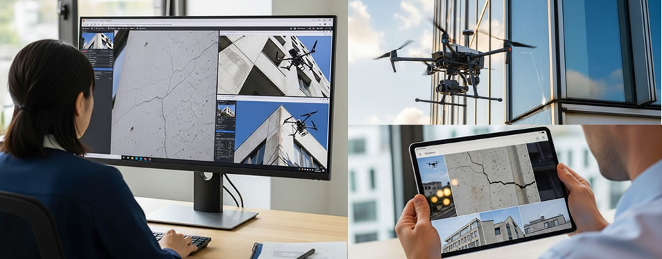 撮影した画像や動画データを解析し、外壁のひび割れやタイルの浮きなどを抽出します。特定建築物定期報告に必要な報告書を作成・納品いたします。